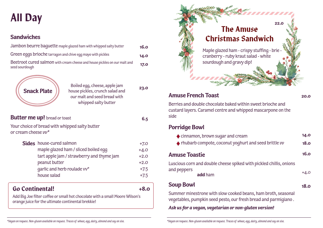 Amuse is a restaurant-quality snack bar, blending European aperitivo with Australasian coffee culture.Like visiting a favourite relative, the door is always open with the smell of baking, and accompanied by the perfect cup of caffeine or hooch to satiate the hour.